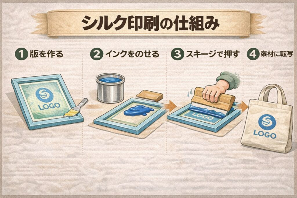 シルク印刷は、版を使ってインクを押し出す印刷方法で、